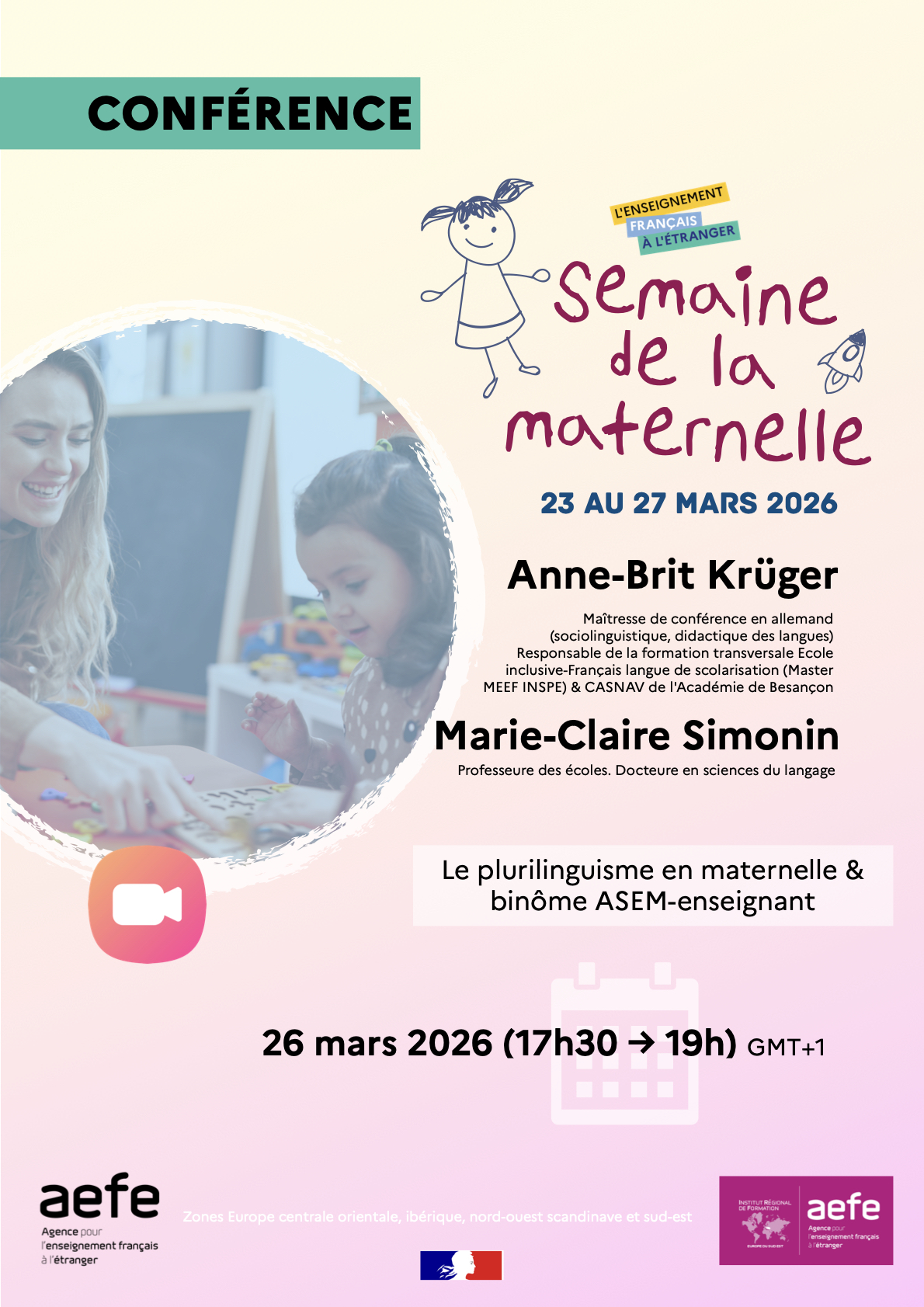 Dans le cadre de la Semaine de la Maternelle de l’AEFE (du 23 au 27 mars 2026), nous avons le plaisir de vous proposer d’assister à deux conférences sur les apprentissages et le bilinguisme chez les jeunes enfants (2-6 ans) :